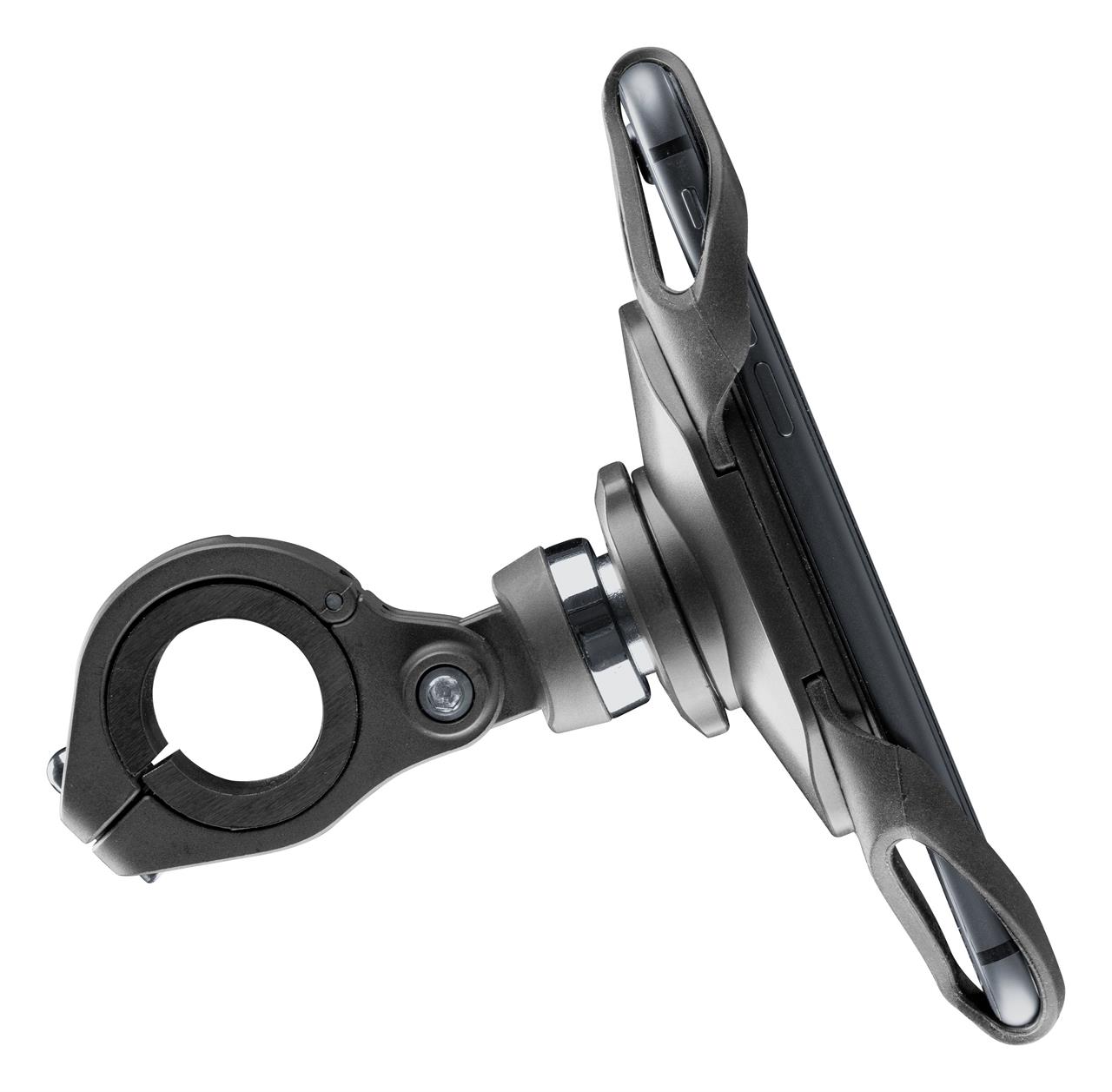 Die Halterung summiert sich um 360°, während sie aus der Klemme gelöst und vom Lenker entfernt werden kann, sodass Sie sie verstauen können, wenn sie nicht verwendet wird.