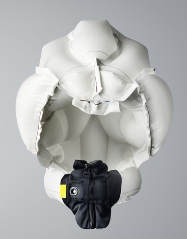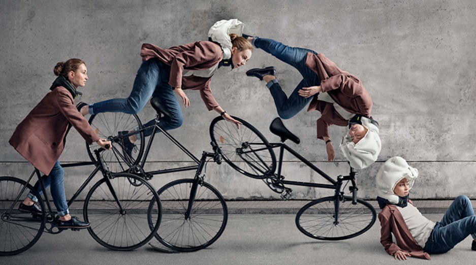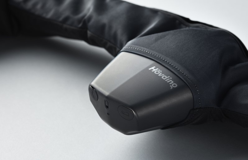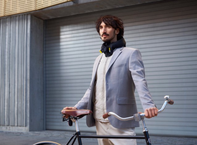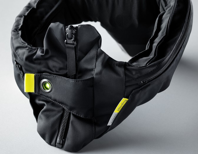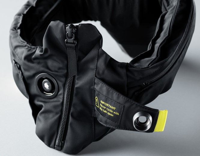 Die integrierten Sensoren im Hövding messen die Bewegung des Fahrers 200 Mal/ Sekunde. Im Fall eines Unfalls löst der Airbag innerhalb von 0,1 Sekunden aus.